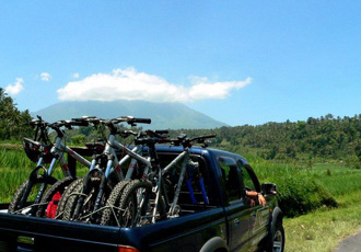 We transfer to Penulisan on the rim of the Batur crater and its highest point at 1700 m. The first part of the trail is on a broken tarmac road through cool pine forests. The road changes to jeep track and ultimately singletrack that takes us along the ridge top with superb views of the crater, and on a clear day down to the east coast. We continue on into the crater itself down the famous ‘lung busting hill’ and onwards on small sand trails, finishing our ride by crossing the 1997 lava field on a small cobbled track. The night is spent in the crater in a small village next to the crater lake. 35km of riding.